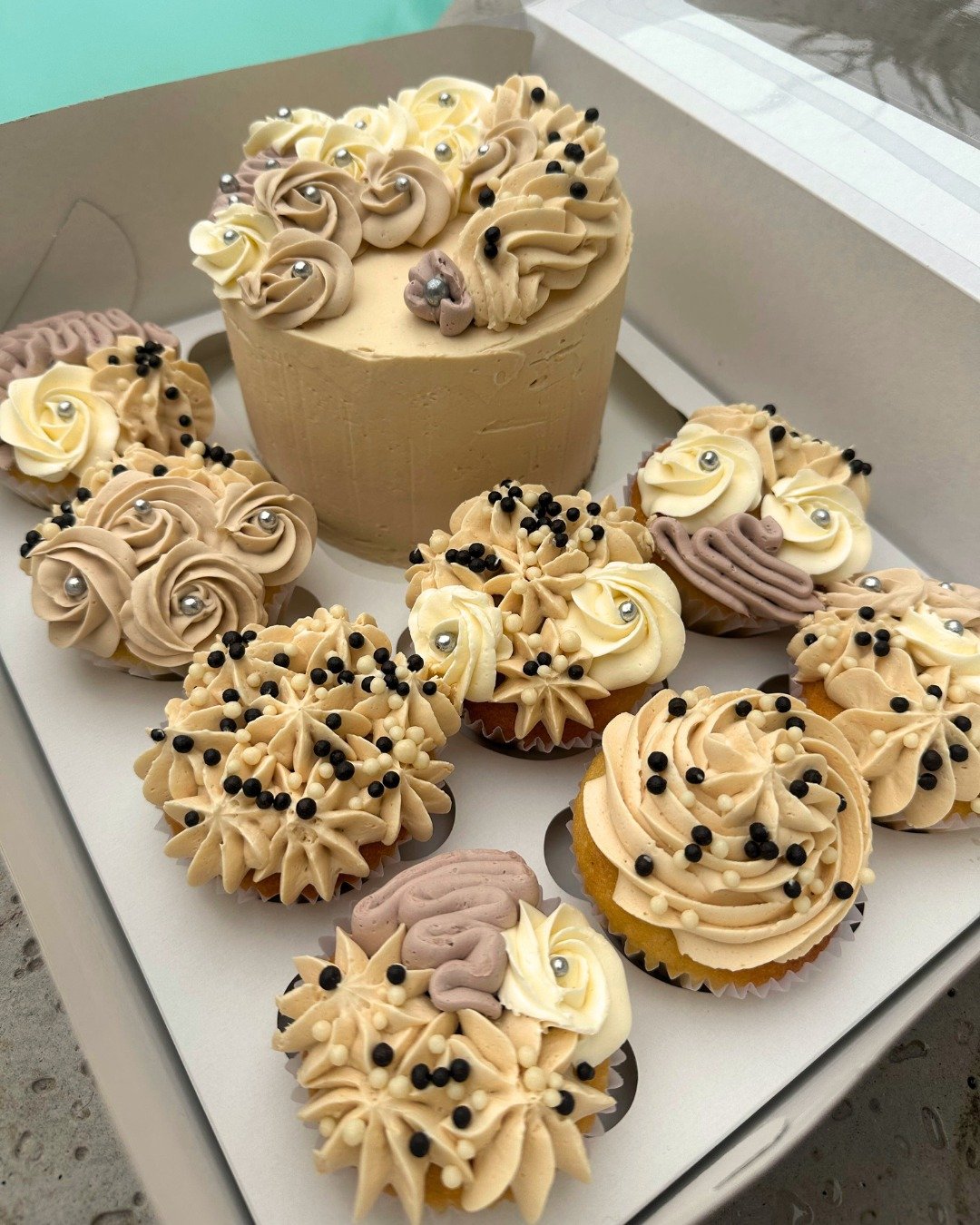 Torta para 6 a 8 personas y 8 muffins decorados en perfecta armonía. Una propuesta refinada para cualquier ocasión especial.