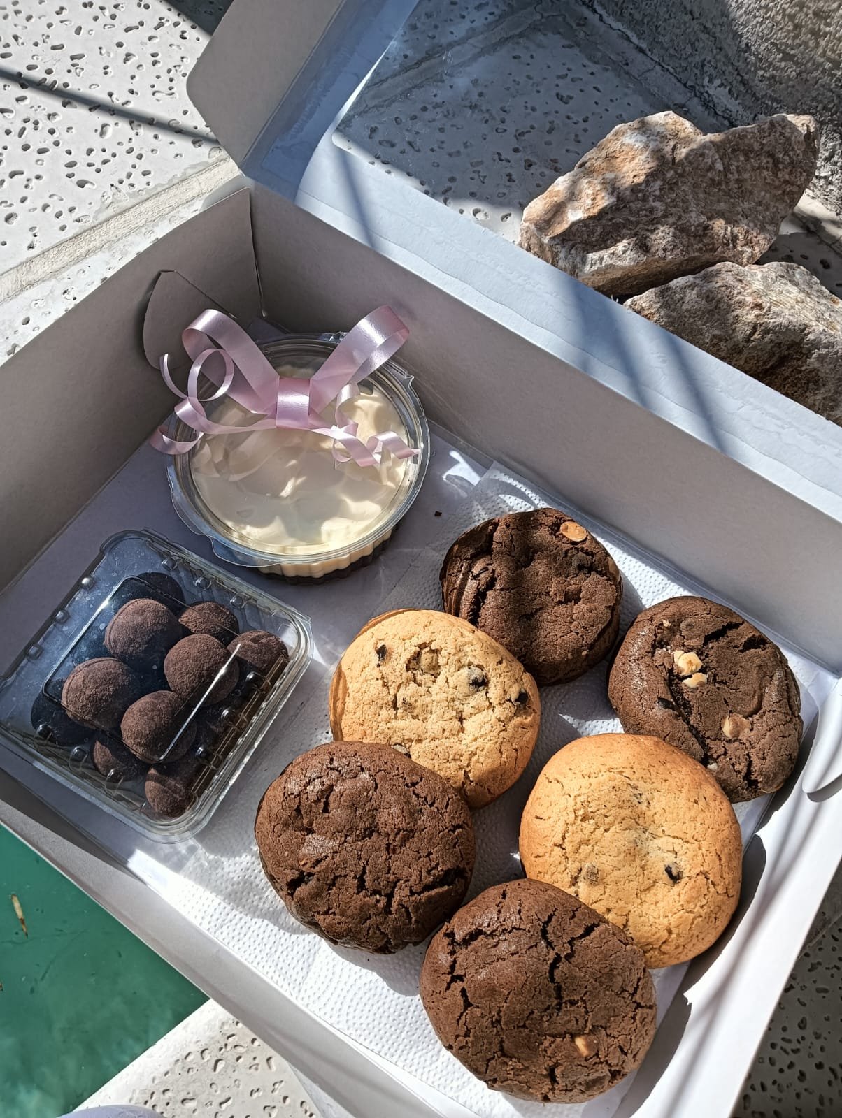 Box con 6 cookies surtidas (incluye variedades rellenas), un postre individual y trufas de chocolate artesanal. Un combo pensado para el verdadero placer dulce.