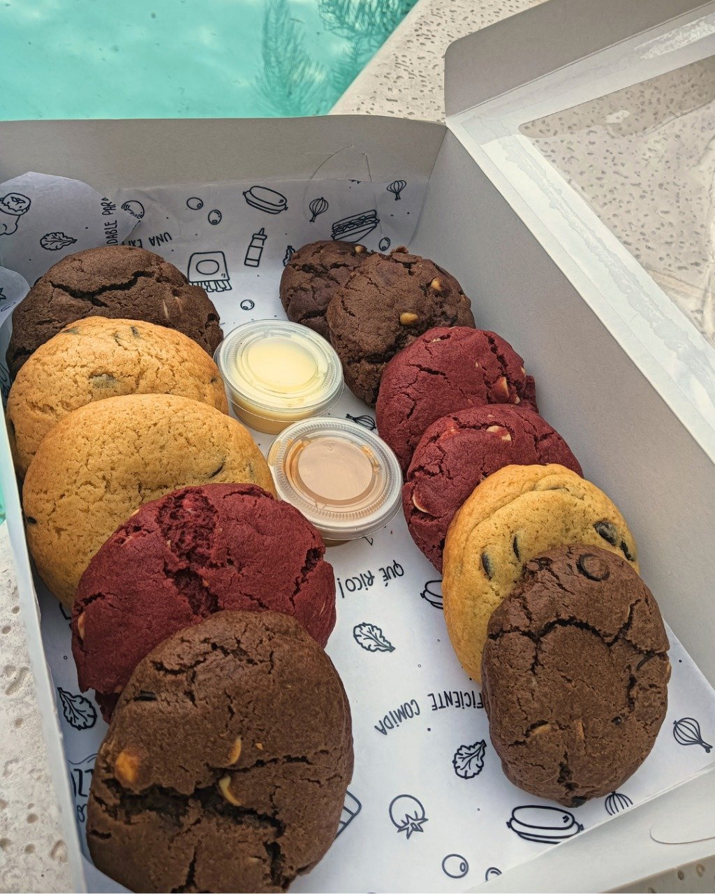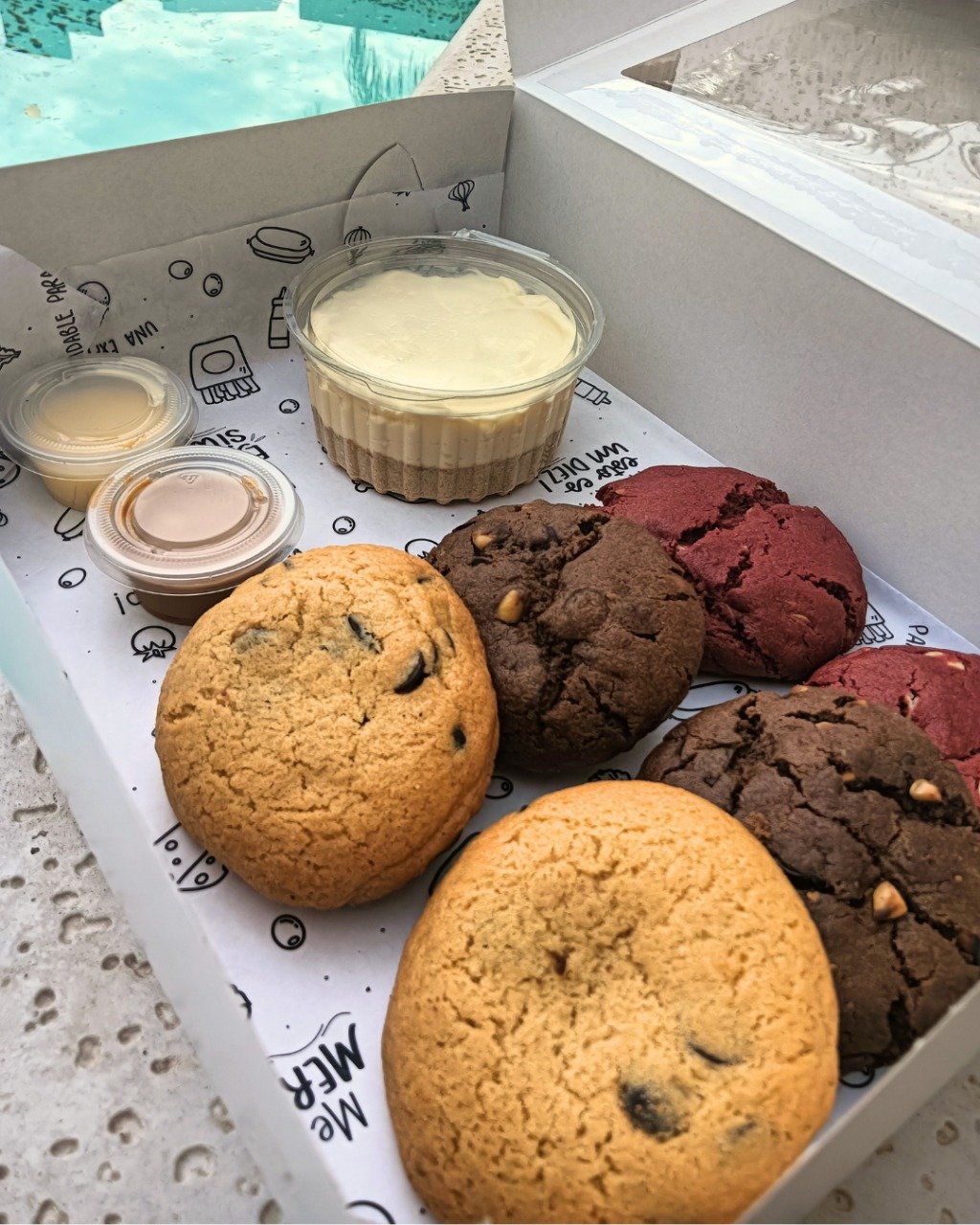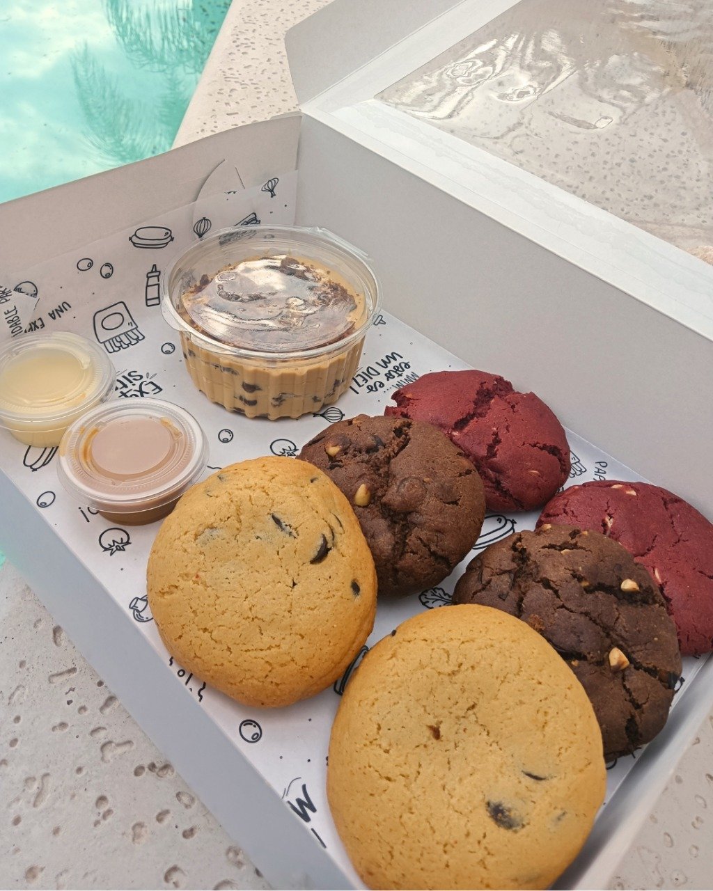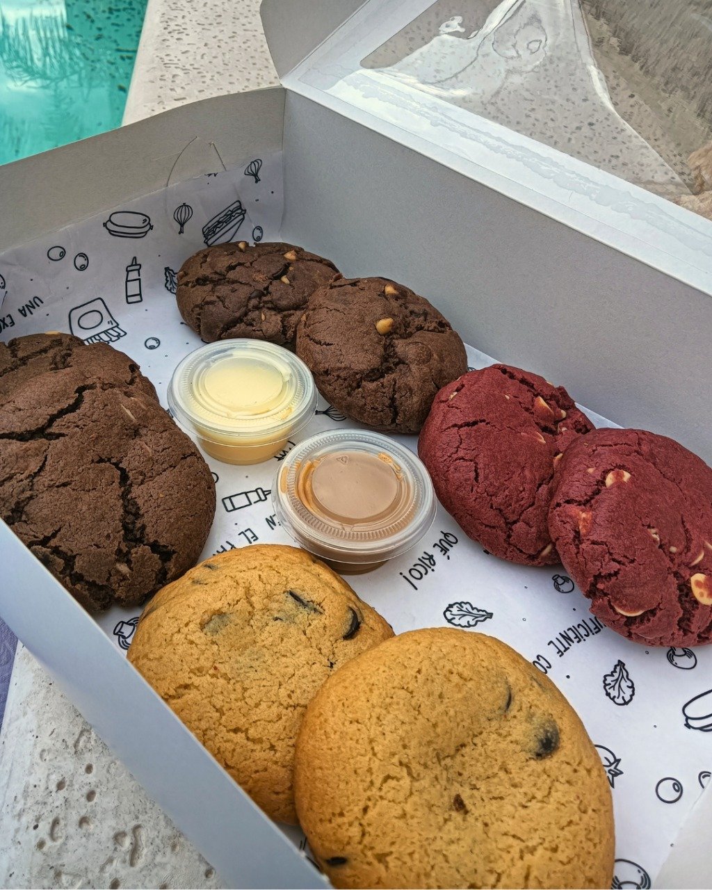 Box con 6 cookies surtidas, 2 salsas de acompañamiento y un postre de Chocotorta
