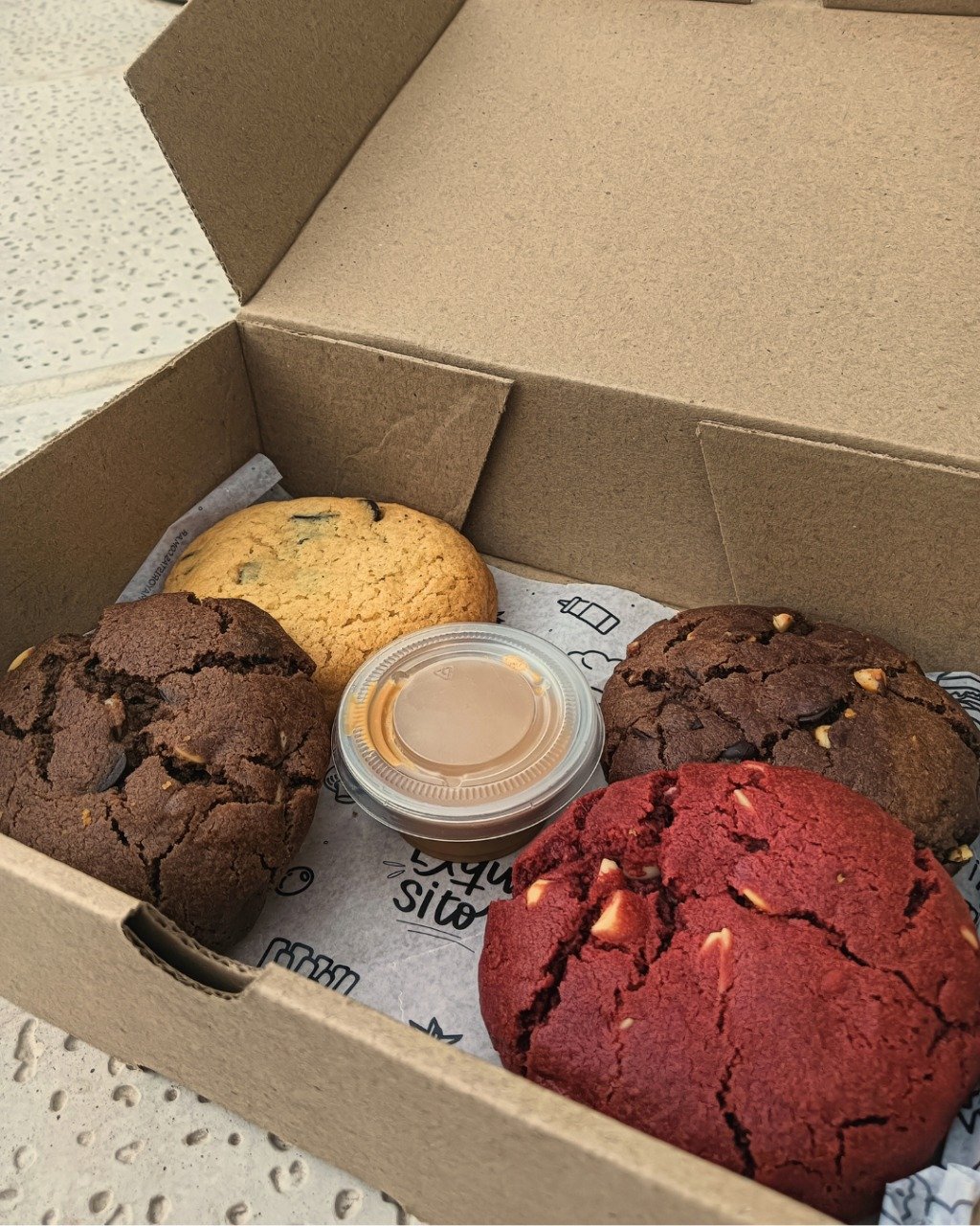 Box con 4 cookies surtidas en 4 sabores: Nutella y Red Velvet (rellenas), Clásica y Doble Chocolate. Incluye 1 salsas de regalo.