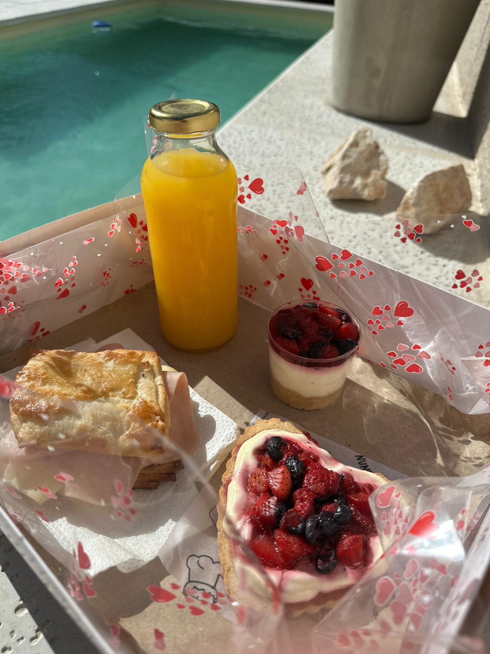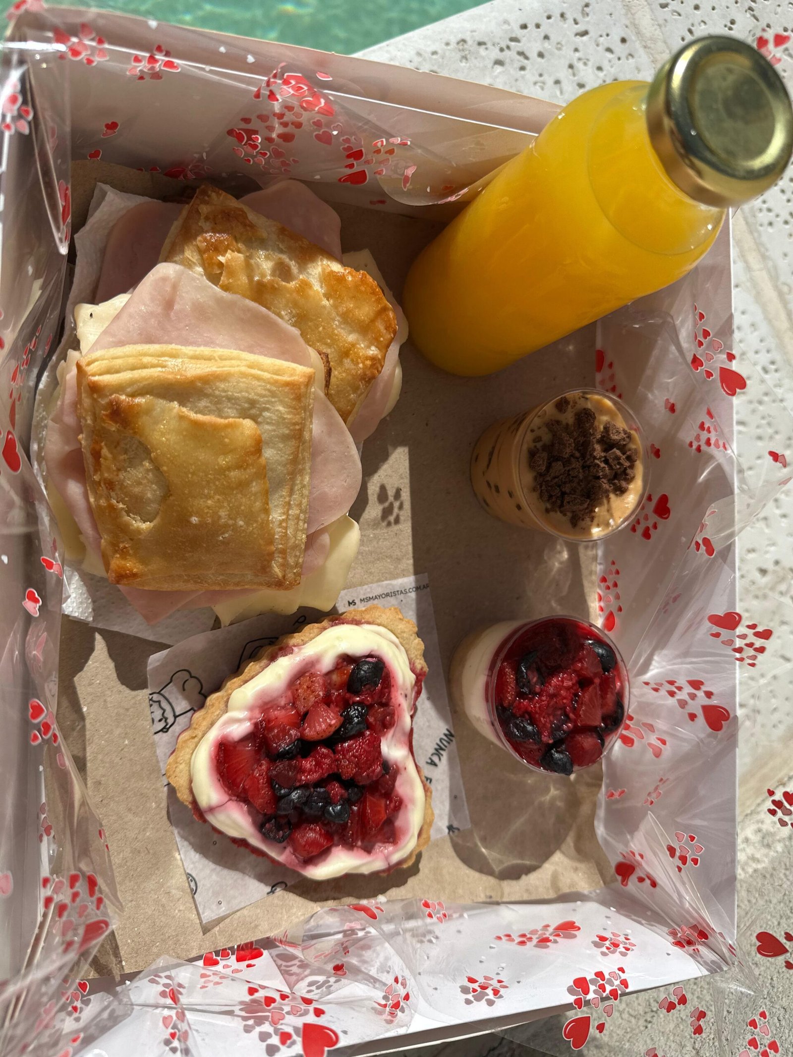 Un mimo dulce y sencillo para mamá 💕. Incluye 1 mini tarta de frutos rojos, 1 postre individual, 1 sándwich hojaldrado y jugo natural.